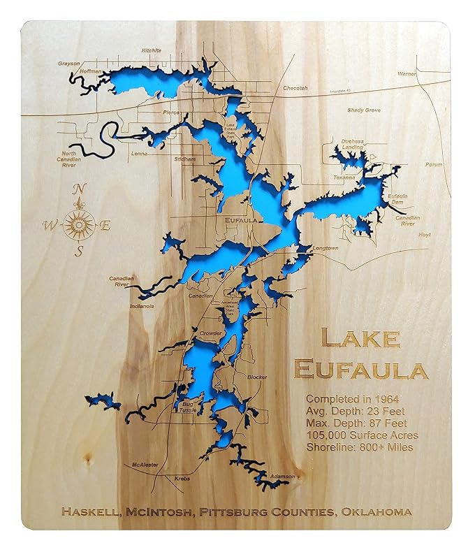 Lake eufaula and eufaula dam on the canadian river, eufaula, okla. The lake is nationally known for it's bass and crappie fishing. You also get to see a lot more of lake eufaula. Lake eufaula is the largest lake in oklahoma, 15th largest in the us, with 102,200 surface acres and 600 miles of shoreline. Lake eufaula is located in the charming town of eufaula, alabama.
